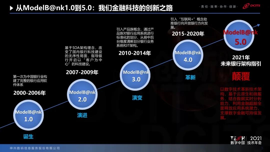 在中国银行业40余年的科技创新发展历程中,神州信息通过发布5代ModelB@nk银行架构整体解决方案,始终指引中国银行业的IT架构整体设计和规划。神州信息是国内最早从事整体IT架构研究的金融科技厂商,ModelB@nk1.0于2000年初始发布,到2015年演进到了4.0版本。来到2021年,历经六年打磨规划的5.0版本积极拥抱金融数字化发展新趋势,通过对未来IT架构的整体规划设计,帮助银行建立符合自身特点的以及信创要求的技术和应用体系,助力业务快速发展与安全运行。