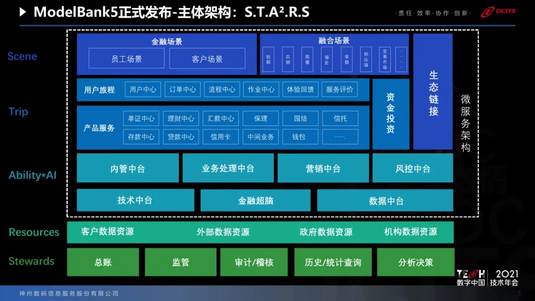 国家提出的信创工程,今年有120家银行单位参与到信创的试点当中,也为我们提出了新的命题,就是如何保证在科技架构下保障国家安全体系的建设。基于科技的变化以及银行业的变化,我们推出了ModelB@nk5.0。