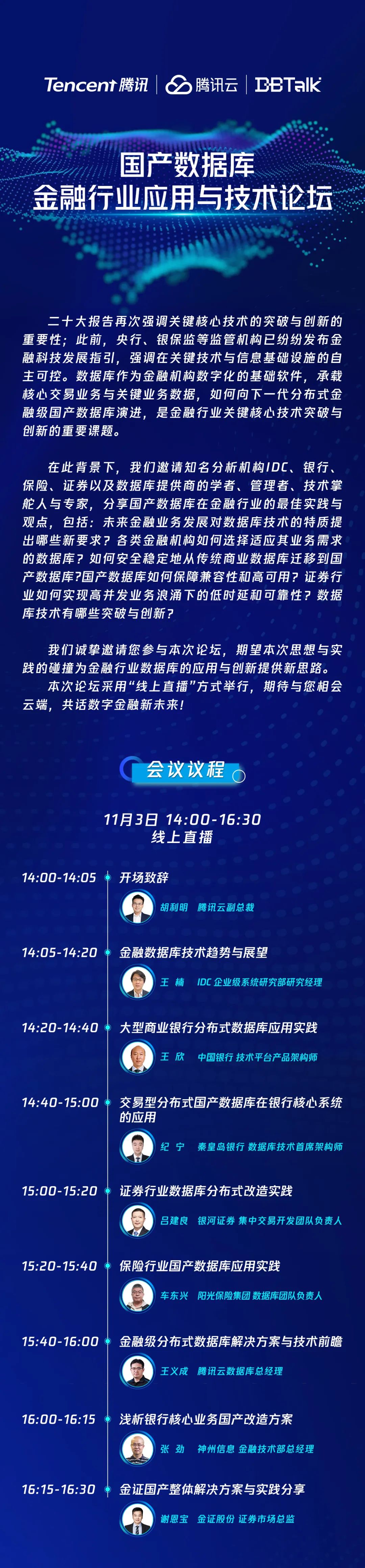 11月3日14:00~16:30,腾讯云邀请IDC分析师,大型商业银行(中国银行)、城商行(秦皇岛银行)、证券(银河证券)、保险(阳光保险)各行业数据库团队业务或技术负责人、腾讯云副总裁胡利明、腾讯云数据库总经理王义成及神州信息金融技术部总经理张劲等众多大咖,一起剖析国产数据库在金融行业应用的最新成果、经验与突破。诚挚邀请您参与本次直播,共话数字金融新未来!