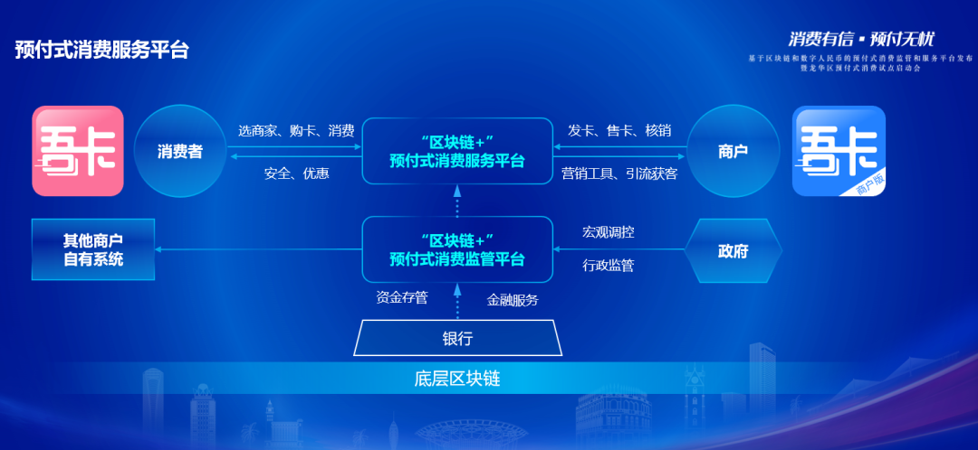 “吾卡”预付式消费监管和服务平台通过探索区块链技术和数字人民币场景应用,将消费者、商户、金融机构、监管各方都纳入生态,构建全方位的可信预付式消费闭环流程,实现基于区块链的各方数据共享、同步及存证,解决退款难、追偿难、维权难等痛点,开启全新的、安全的可信消费新模式,提升社会治理水平,促进行业、生态健康发展,同时以“科技+数据+场景”融合创新,探索场景金融更多新可能。为解决预付式消费引发的诸多问题,海南省海口市龙华区立项首创的“预付式消费监管和服务平台建设(试点)”,2022年9月列入区级第三批揭榜挂帅榜单,将为龙华区预付式消费打造全新模式,保证政府层有力监管的同时保障商户和消费者双方的权益。