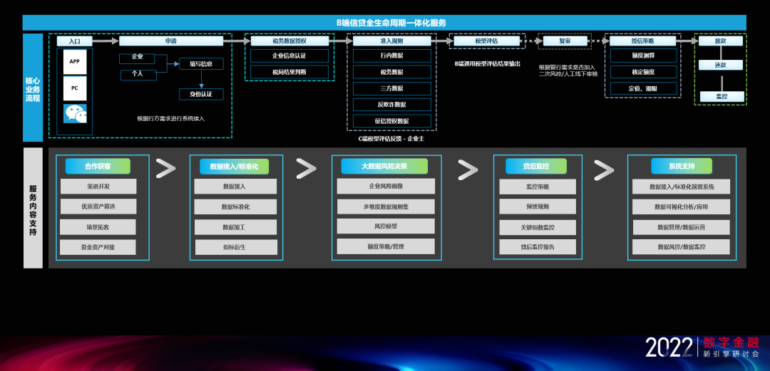 神州信息天昊中小微信贷系列产品依托大数据分析及数据资源整合能力,以信用评估为基础结合数据建模技术,构建中小微信贷产品赋能体系。“产品+风控”双效赋能综合解决方案既可以为C端信贷产品赋能,又可以为B端信贷产品赋能。此外,还可以打造B+C叠加的赋能服务方案,包括风控融合、产品创新、联合运营的服务模块,从底层数据清洗、风险挖掘,到指标设计,帮助金融机构搭建企业风控大数据指标体系。