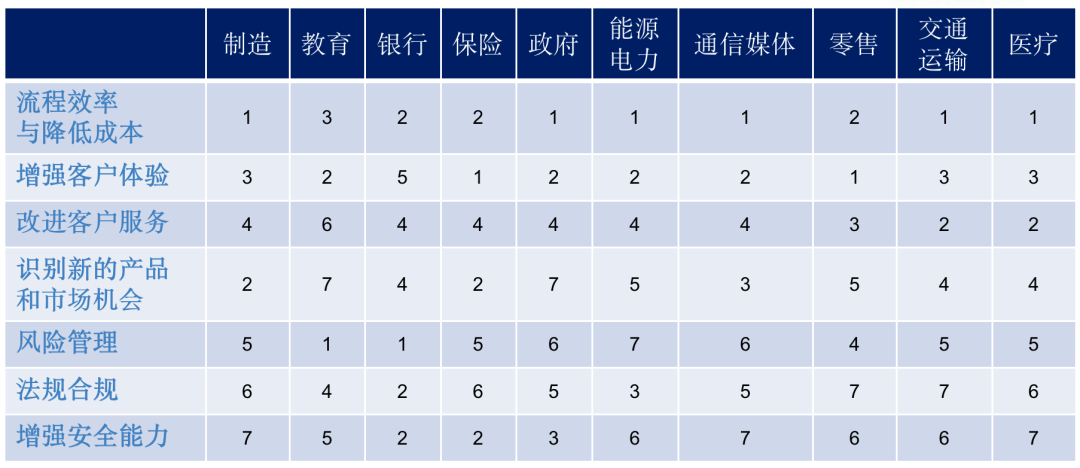 各个行业都希望通过数据资产的盘点和运营解决业务问题。而通过我们的实践和Gartner曾经的研究,发现流程成本、客户体验和产品创新是企业数据资产运营的最核心的诉求。尤其是通信行业最为迫切。数字越小,代表迫切性越强。