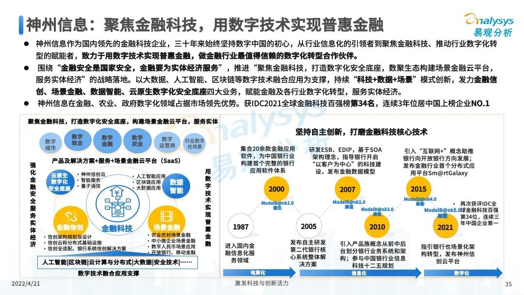 近日,易观分析发布的《中国数字科技专题分析2022》公布了“2021年度数字科技创新型企业TOP50”榜单,神州信息继2020年榜单后再度入选。