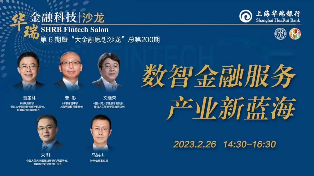 2月26日下午,由上海华瑞银行、中国人民大学国际货币研究所(IMI)与中国人民大学金融科技研究所联合主办的“华瑞金融科技沙龙”(第6期)暨“大金融思想沙龙”(总第200期)在线上进行。本期沙龙主题围绕“数智金融服务产业新蓝海”,由IMI联席理事长、上海华瑞银行董事长曹彤行长做主题报告,IMI联席所长、浙江大学国际联合商学院院长、金融科技研究院院长贲圣林,神州信息副总裁马洪杰,中国人民大学信息学院院长、高瓴人工智能学院执行院长文继荣等专家参与了研讨。沙龙由IMI副所长、金融科技研究所执行所长宋科主持。