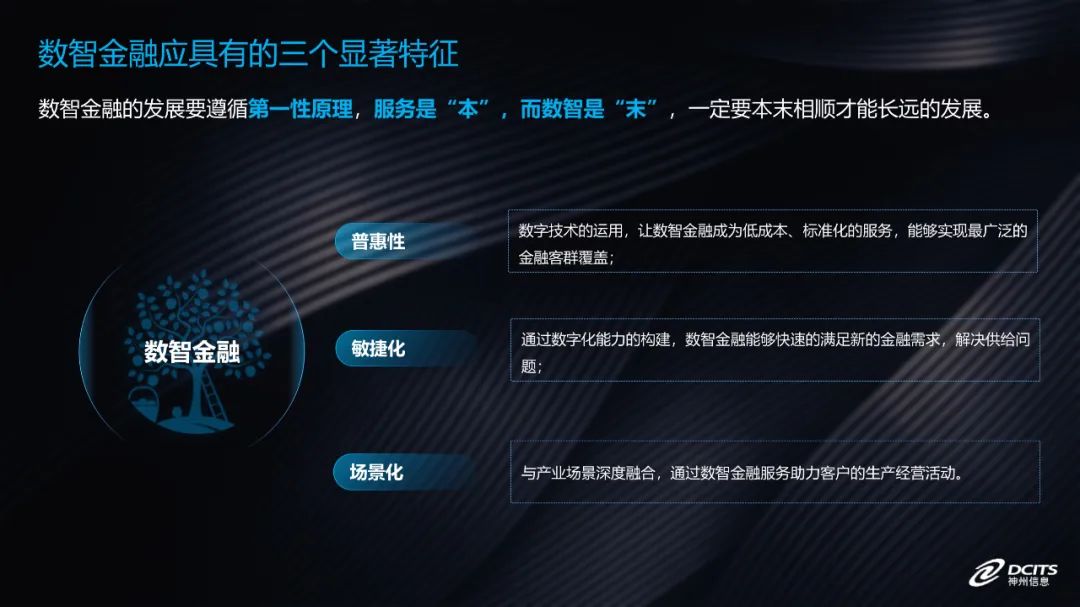 回到我们今天的话题“数智金融”,如果我从一名客户的角度出发,只要是能够让我便捷的获取所需的金融服务,对我而言就是“数字化和智慧化”的金融。反之,哪怕应用了再多的先进技术,那也是无效的服务。所以我认为数智金融的发展要遵循第一性原理,服务是“本”,而数智是“末”,一定要本末相顺才能长远的发展。