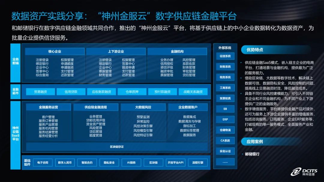 例如,去年我们神州信息和邮储银行在数字供应链金融领域共同合作,推出的“神州金服云”平台,就是将基于供应链上的中小企业数据转化为数据资产,为批量企业提供信贷服务。基于该模式的成功,我们也在加快向其他产业场景的覆盖。
